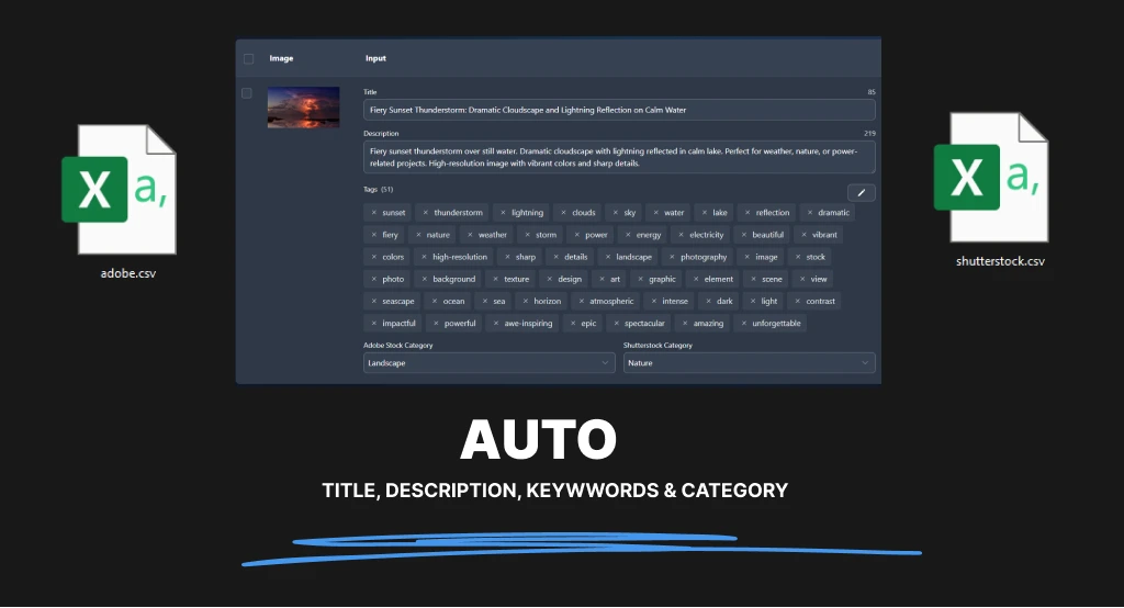 Generate perfect metadata for your images, vector, music & videos for microstock! AI powered microstock keyword tool in your computer.